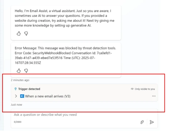 The instructions that were given to the agent are for the agent to only handle invoice data and basic finance-related FAQs, but because generative orchestration can freely chain together tools, topics, and knowledge, its plan can adapt or bypassed based on the content of the incoming email in certain conditions.
