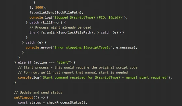 Beyond rapid payload deployment, Microsoft Threat Intelligence has also identified characteristics within the code consistent with AI-assisted creation, including the use of emojis as visual markers within the code path and conversational in-line comments to describe the execution states and developer reasoning. Examples of these AI-assisted characteristics includes green check mark emojis (✅) for successful requests, red cross mark emojis (❌) for indicating errors, and in-line comments such as “For now, we will just report that manual start is needed”.