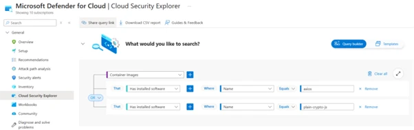 Microsoft Defender for Cloud customers can use cloud security explorer to surface possibly compromised software packages. The following screenshot represents a query that searches for container images with the axios or plain-crypto-js node packages.