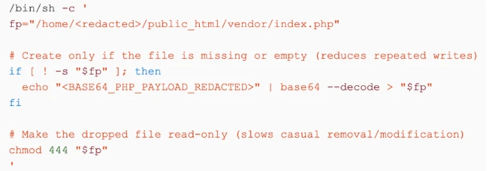 The delivery mechanism followed a similarly deliberate design. In multiple environments, web-facing processes such as php-fpm spawned shell commands that reconstructed obfuscated PHP files using the recognizable echo | base64 -d > file.php pattern. In other cases, equivalent commands were executed within restricted shell environments, such as through cPanel jailshell, or established via scheduled tasks at the hosting account level.