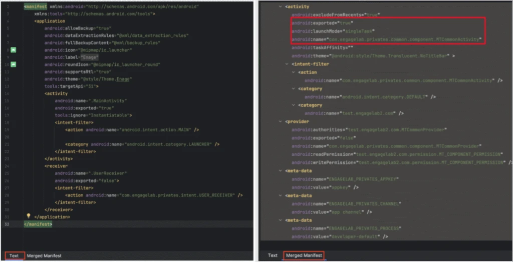 EngageLab addressed the vulnerability in version 5.2.1, released on November 3, 2025. In the fixed version, the vulnerable activity is set to non-exported, which prevents it from being invoked by other apps.