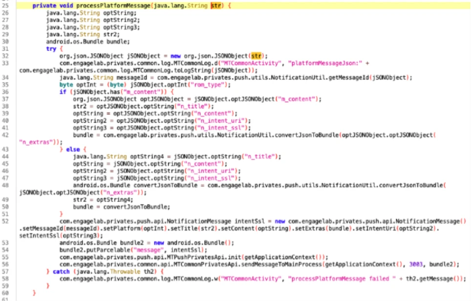 This method (see figure below) begins by initializing the uri variable on line 10 using the data provided in the incoming intent. If the uri variable is not empty, then – according to line 16 – it invokes the processPlatformMessage():