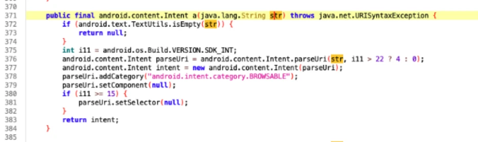 Another notable point is that the parseUri() method (at line 376) is called with the URI_ALLOW_UNSAFE flag (constant value 4), which can permit access to an application’s content providers [6] (see exploitation example below).