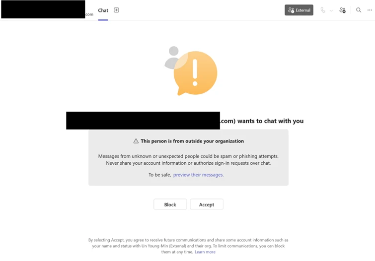 The intrusion begins with abuse of external collaboration features in Microsoft Teams, where an attacker operating from a separate tenant initiates contact while impersonating internal support personnel as a means to social engineer the user. This activity does not stem from a weakness in Microsoft Teams or its built‑in security protections. Instead, attackers abuse legitimate collaboration features by persuading users to override multiple, clearly presented security warnings, highlighting the broader challenge of defending against attacks driven by social engineering rather than technical exploitation.