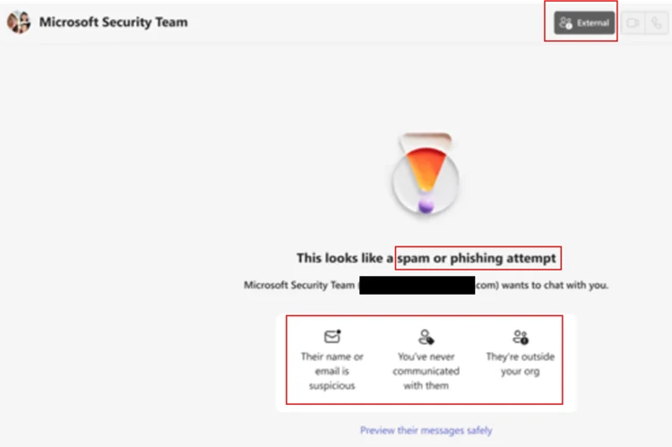 Microsoft Teams applies multiple security controls at the point of first external contact – before any chat, call, or file exchange occurs – including external tenant labeling, Accept/Block prompts, message previews, and phishing indicators designed to help users assess risk prior to engagement. However, this attack chain relies on convincing users to bypass those warnings and voluntarily grant remote access through legitimate support tools. In observed intrusions, risk is introduced not by external messaging alone, but when a user approves follow on actions — such as launching a remote assistance session — that result in interactive system access.