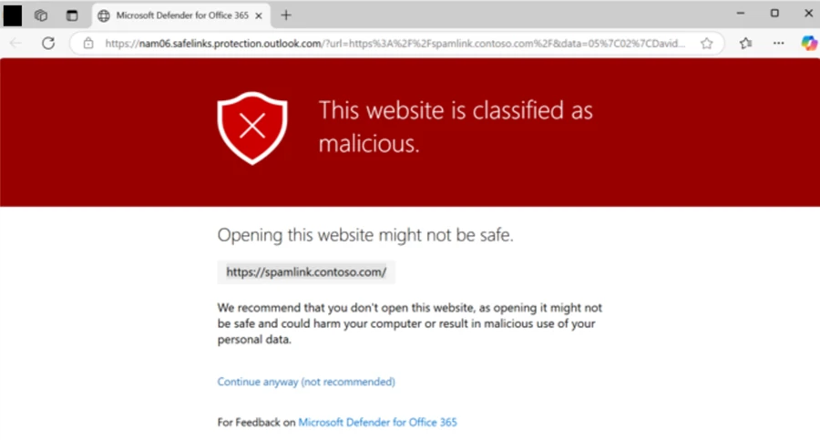 Safe Links for time-of-click protection warns users when URLs from Teams chat messages are malicious: