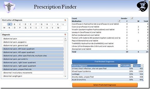 The application dubbed “Prescription Finder” uses historical medical data to allow a physician to display the top 10 medications prescribed for any particular medical diagnosis or set of diagnoses through a simple and effective Excel-based user interface.  Going one step further, it allows the physician to explore possible contraindications by using predictive analytics to suggest related conditions that a patient may have so the physician can make the best choice for their patient.