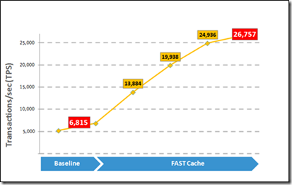 Back to SQL Server 2012. We set out to demonstrate how the VNX FAST Suite can enhance SQL Server 2012 and its AlwaysOn feature. EMC’s VNX has achieved compelling results leveraging FAST Cache, a VNX technology that moves hot spots onto SSD’s in real time. Based on extensive testing, VNX FAST Cache was able to accelerate transactions per second (TPS) of primary and active secondary copies by up to 4 times that of an all hard disk drive-based storage subsystem.
