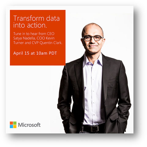 Tomorrow’s the day! Tune in to hear from Microsoft CEO Satya Nadella, COO Kevin Turner, and Data Platform Group CVP Quentin Clark about Microsoft’s approach to data, and how the latest advancements in technology can help you transform data into action.
