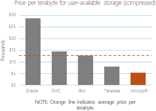 Utilizing commodity servers, storage, drives and networking devices from our three hardware partners (Dell, HP, and Quanta), Microsoft is able to offer a high performance scale out data warehouse solution that can grow to very large data sets while providing redundancy of each component to ensure high availability. Starting with standard servers and JBOD (Just a Bunch Of Disks) storage arrays, APS can grow from a simple 2 node and storage solution to 60 nodes. At scale, that means a warehouse that houses 720 cores, 14 TB of RAM, 6PB of raw storage and ultra-high speed networking using Ethernet and InfiniBand networks while offering the lowest price per terabyte of any data warehouse appliance on the market (Value Prism Consulting).