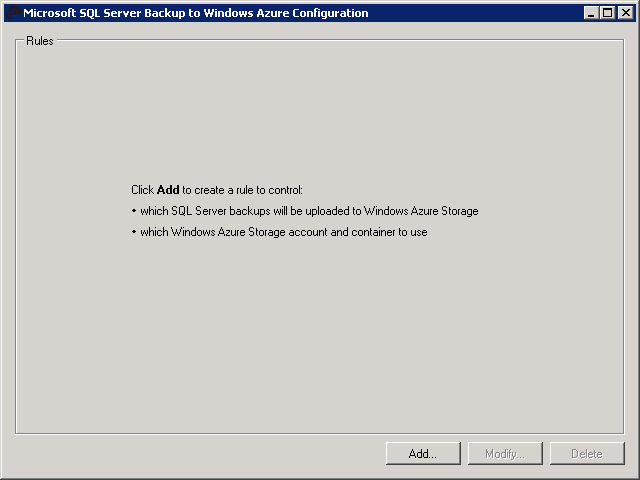 Step 3: Create your rules.  Start the Microsoft SQL Server Backup to Microsoft Azure Tool Service by running SQLBackup2Azure.exe.  Going through the wizard to setup the rules allows the program to process the backup files that should be encrypted, compressed or uploaded to Azure storage. The Tool does not do job scheduling or error tracking, so you should continue to use SQL Server Management Studio for this functionality.