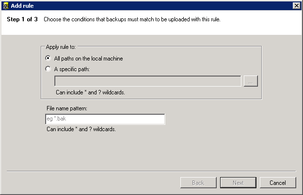 The rule will tell the Tool what local folder to watch for backup file creation. You must also specify the file name pattern that this rule should apply to.