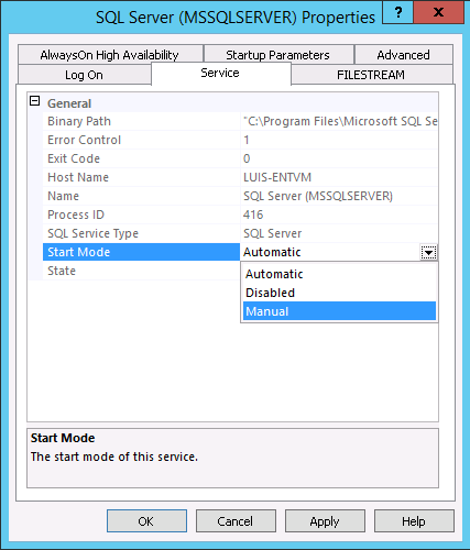 3) Configure the Start Mode of SQL Server and SQL Agent startup as Manual