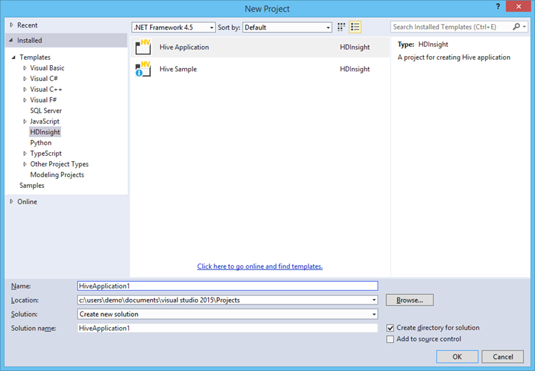 For more complex script development and lifecycle management, you can create Hive projects within Visual Studio. In the new project dialog (see below) you will find a new HDInsight Template category. A helpful starting point is the Hive Sample project type. This project is pre-populated with a more complex Hive query and sample data for the case of processing web server logs.