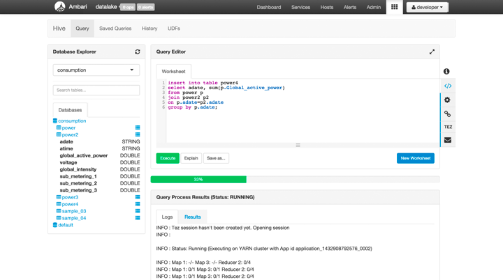With HDP 2.3 we focus on the SQL developer and provide an integrated experience that allows for SQL query building, displaying a visual “explain plan”, and allowing for an extended debugging experience when using the Tez execution engine.  A screenshot of what we’ve developed shown below: