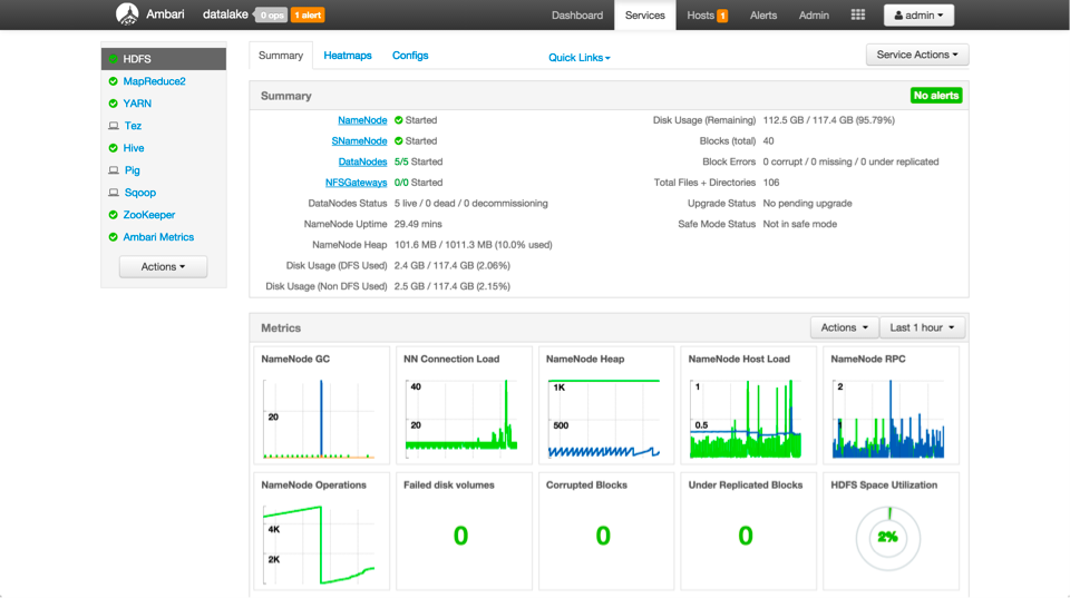 In HDP 2.3 we have developed customizable dashboards for a number of the most frequently used components.  This allows for each customer to develop a tailored experience for their environment and decide which metrics they care about most.  Shown below is the HDFS Dashboard: