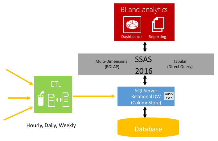 Traditionally, customers have modeled the data using multidimensional online analytical processing (MOLAP) with pre-aggregated data or with Tabular Model and the source of data in the database with periodic ETL (Extract, Transform and Load). The picture below shows a typical deployment using SQL Server for relational DW and SQL Server Analysis Server (SSAS) for data modelling.