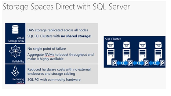 • Storage Spaces Direct in Windows Server 2016 allows use of industry-standard servers with local storage as a highly available, scalable alternative to expensive storage area networks (SANs) — with read speeds that can exceed 25 GB/second.
