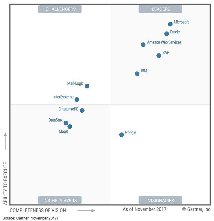 We’re happy to report that Gartner has positioned Microsoft in the Leaders Quadrant in the 2017 Magic Quadrant for Operational Database Management Systems again this year. This is the third year that Microsoft has been positioned farthest in completeness of vision and ability to execute in the operational database management systems market.