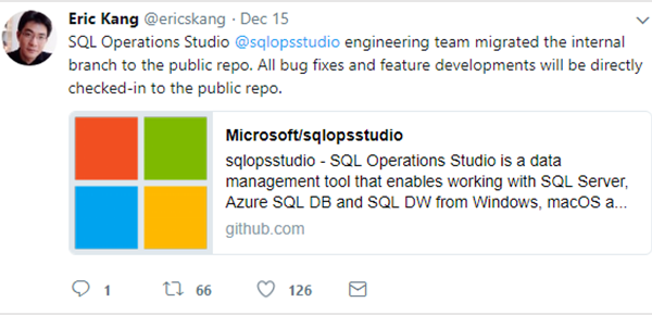 To provide better transparency with the SQL Operations Studio community, we have decided to migrate the Github internal branch to the public repo. This means any bug fixes, feature developments, or even test builds can be publicly viewed before an update is officially announced.