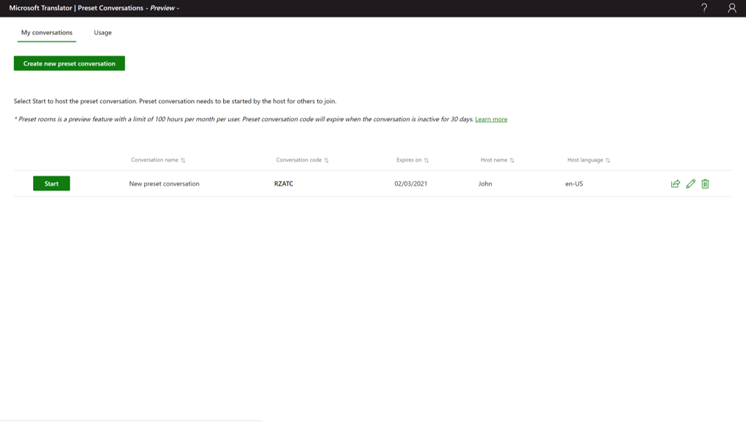 Svi unaprijed postavljeni kodovi za razgovor dostupni su na administratorskoj ploči. Unaprijed postavljeni razgovori značajka su pretpregleda s ograničenjem od 100 sati mjesečno po korisniku. Microsoft Translator neće prikupljati podatke, audiozapise ili tekst iz vašeg razgovora, već samo pohranjuje kôd tako da ga možete koristiti u budućnosti.