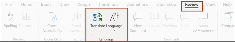 Per tradurre il testo in PowerPoint, selezionare il testo, quindi passare alla cartella Recensione Tab e selezionare Traduci.