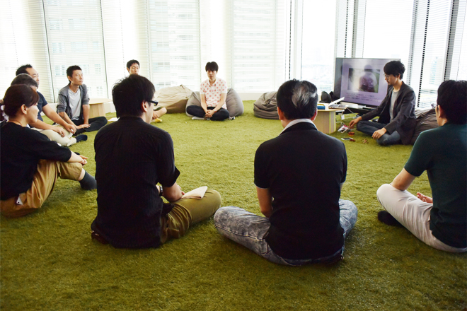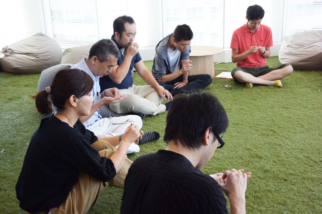 同社の芝生スペースに15名程度の参加者の方が集まって、円座で座る。この人数の規模感も中村氏がこだわっているポイントだ。