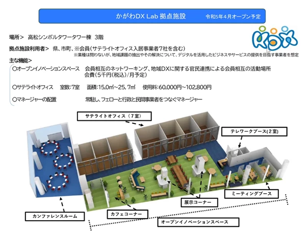 2023 年 4 月には高松シンボルタワー内に「かがわ DX Lab」の活動拠点施設がオープン予定で、民間事業者を迎えて、官民連携による地域 DX のハブとなることをめざします。