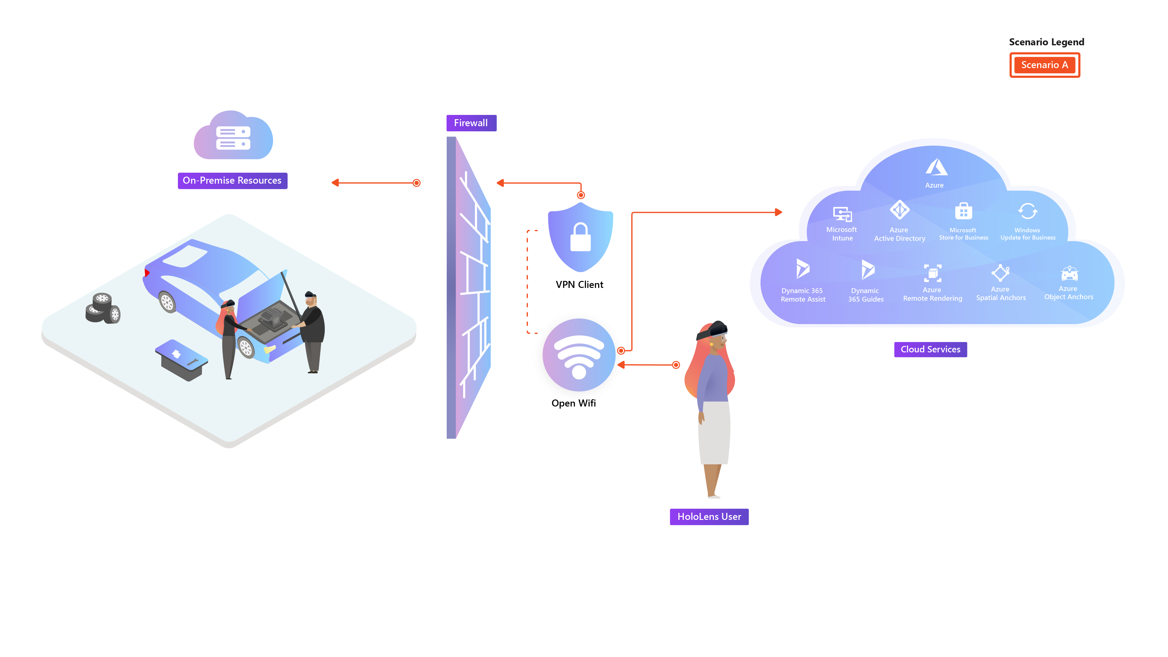 このシナリオは、会社内にマネージド モバイル デバイスを展開することに相当します。 HoloLens 2は、主に企業ネットワーク外部の環境で使用するためにデプロイされます。 企業リソースにアクセスできないか、VPN 経由で制限される可能性があります。