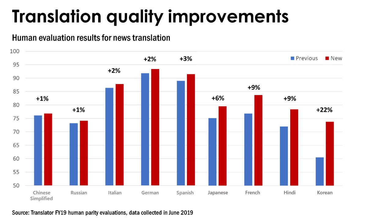 Šiandien mes džiaugiamės galėdami pranešti, gamybos mūsų naujausios kartos neuroninių mašininio vertimo modelių prieinamumą. Šie modeliai apima didžiąją dalį mūsų mokslinių tyrimų sistemos gėris ir dabar galima pagal nutylėjimą, kai naudojate Microsoft Translator API. Šie nauji modeliai yra prieinami šiandien kinų, vokiečių, prancūzų, hindi, italų, ispanų, japonų, korėjiečių ir rusų, iš ir į anglų. Netrukus bus daugiau kalbų.