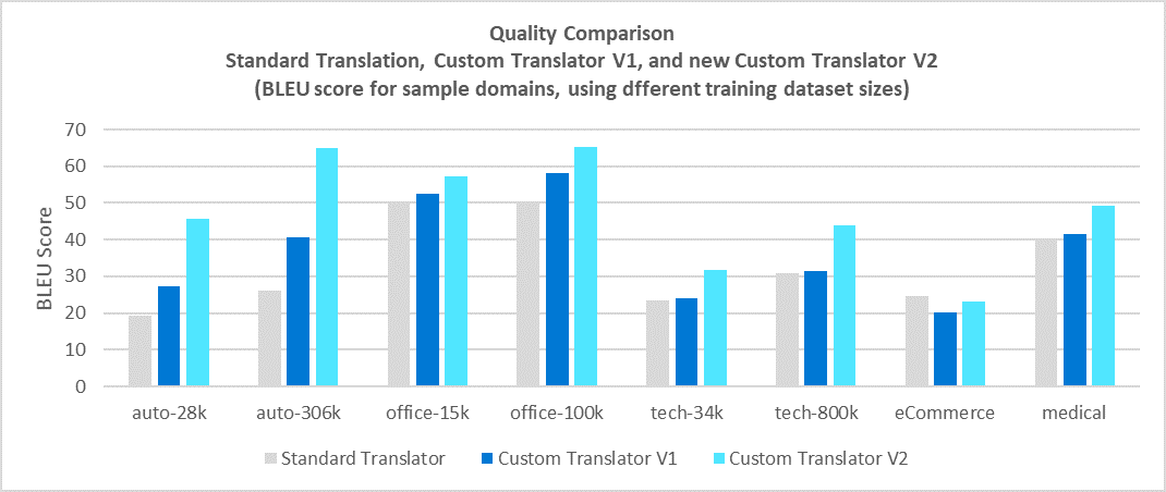 Mes naudojame BLEU balas (standartinis būdas mokslinių tyrimų bendruomenėje), siekiant įvertinti naujai parengto pradinio modelio vertimo kokybę. Vienas ar du BLEU taškų pelnas yra vertas laimėjimas. Tinkinto vertėjo V2 platformos atnaujinimas suteiks reikšmingų patobulinimų, palyginti su ankstesne V1 platforma. Toliau pateiktoje juostinėje diagramoje pavaizduotas kai kurių sričių vertimo kokybės BLEU balų pagerėjimas ir mokymo duomenų rinkinio dydžio poveikis.