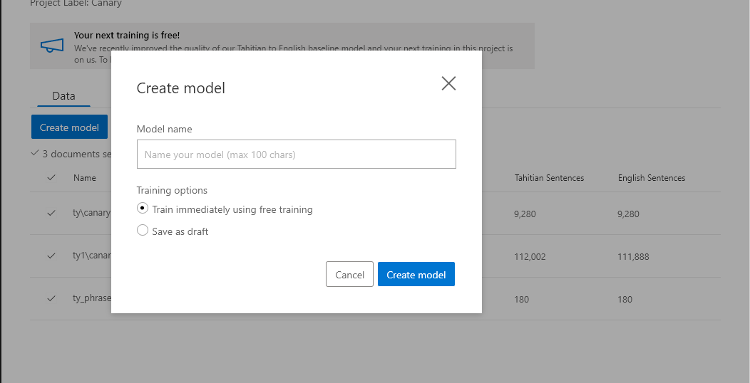 Norėdami sukurti pasirinktinį modelį, peržiūrėkite anksčiau pateiktą sparčiosios paleisties vaizdo įrašą ir peržiūrėkite docs.microsoft.com dokumentaciją: https://docs.microsoft.com/azure/cognitive-services/translator/custom-translator/overview