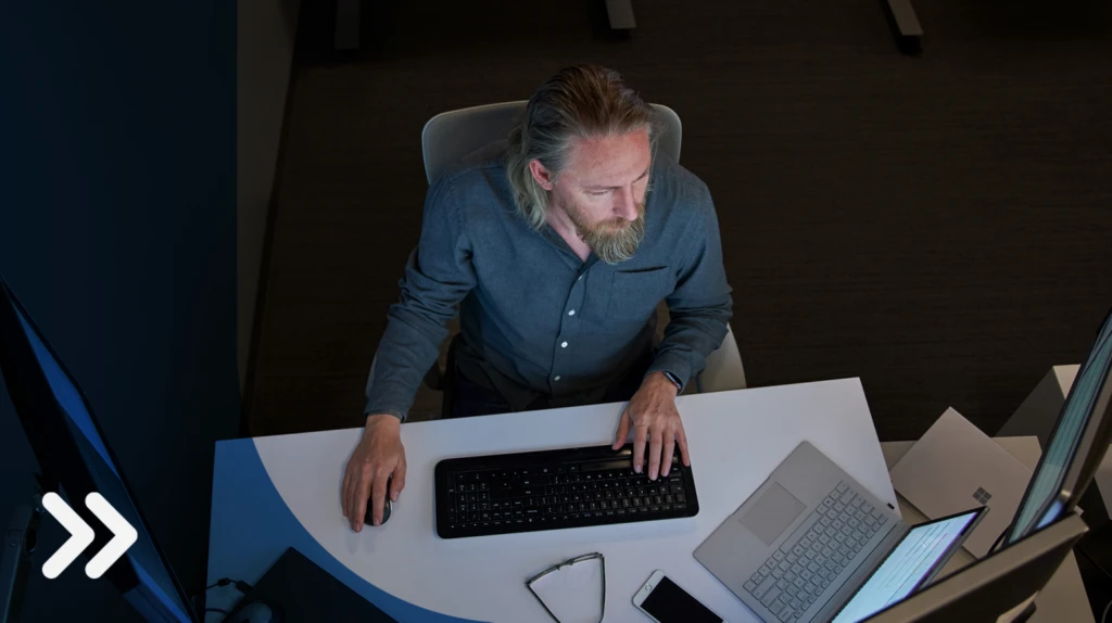 Top-down view of a bearded man in a gray/blue shirt seated at a desk working on a Surface laptop connected to three large monitors. Desktop has phone, glasses, mouse and other laptops on it.