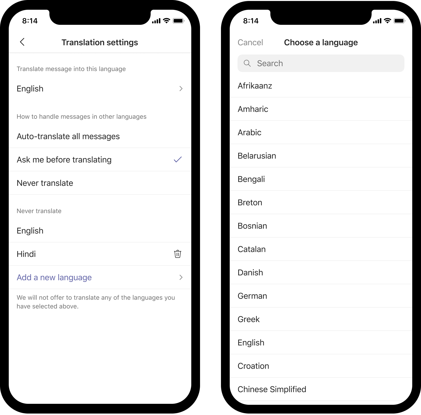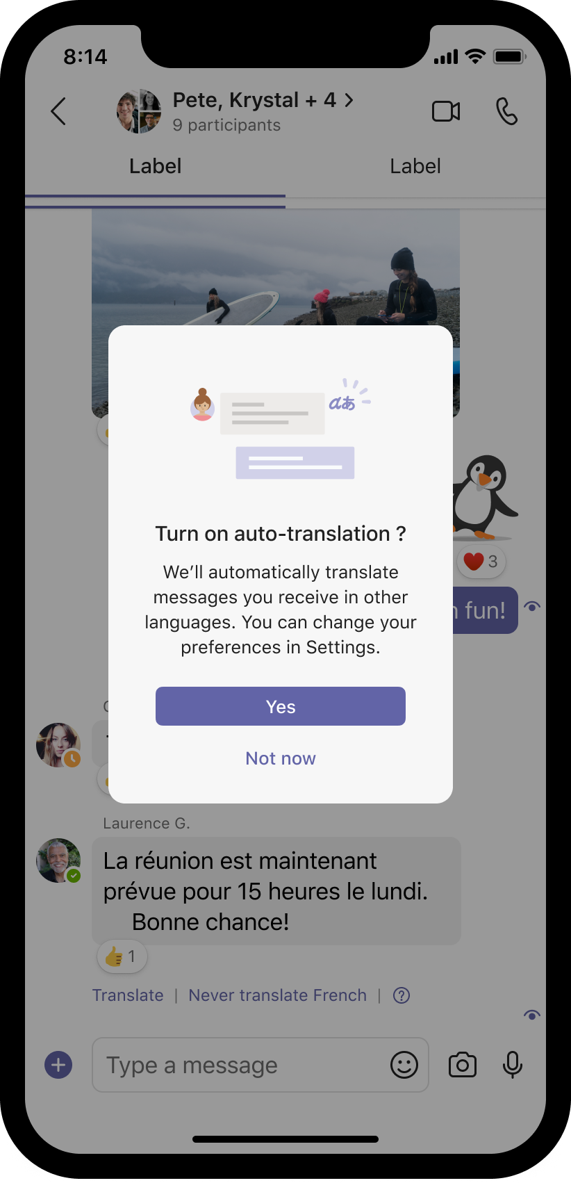 เปิดตัวไมโครซอฟท์ Teams สําหรับอุปกรณ์เคลื่อนที่สําหรับ iOS และ Android การแปลข้อความอัจฉริยะในแชท. เมื่อผู้ใช้ได้รับข้อความแชทในภาษาที่พวกเขาไม่เข้าใจ Teams จะแจ้งให้พวกเขาทราบพร้อมท์ให้แปลข้อความแชทเป็นภาษาที่ผู้ใช้ต้องการ ผู้ใช้ยังสามารถปรับเปลี่ยนพฤติกรรมการแปลแชทในแบบของคุณได้โดยเปิด การแปลอัตโนมัติ.